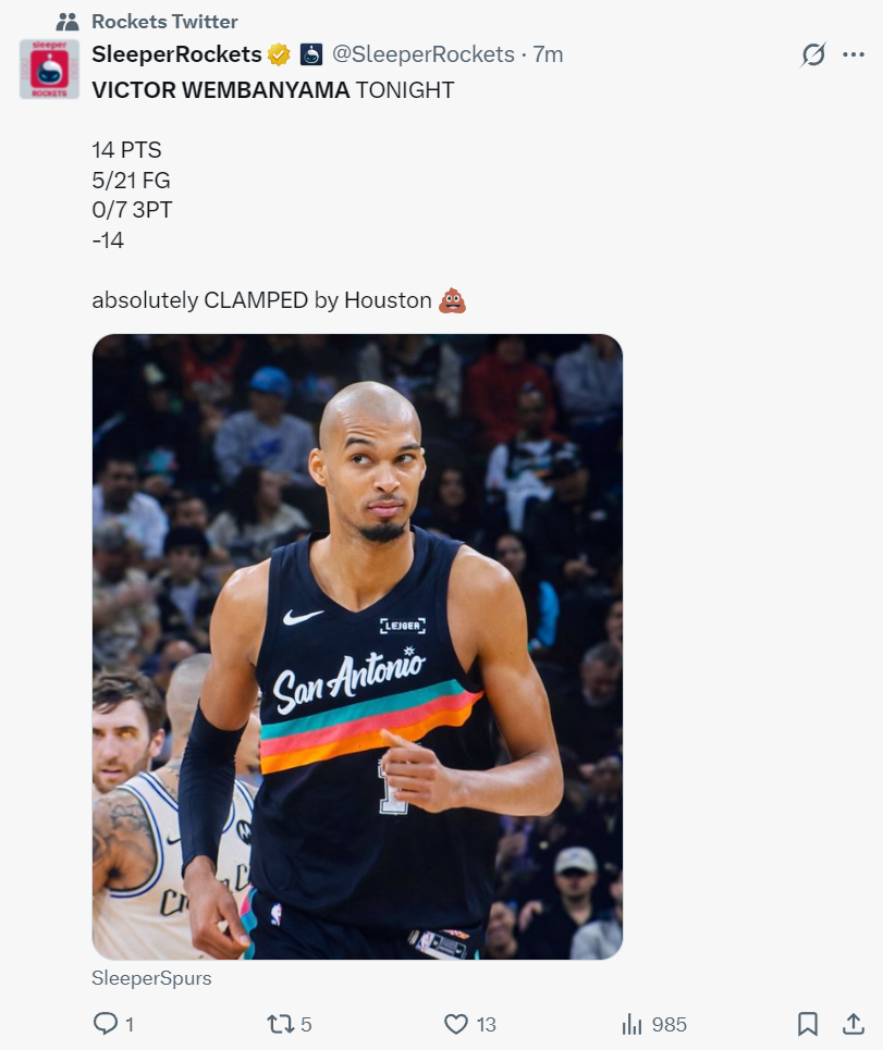北京时间1月21日,马刺以106-111被火箭逆转结束三连胜。这场比赛马刺一度领先火箭16分,他们前三节的三分投得很好,可末节火箭提升防守后马刺三分连连打铁,最关键的两个三分球文班亚马都未能命中,下半场文班亚马11中1拉胯无比(还有一个补扣是垃圾时间刷分)。
